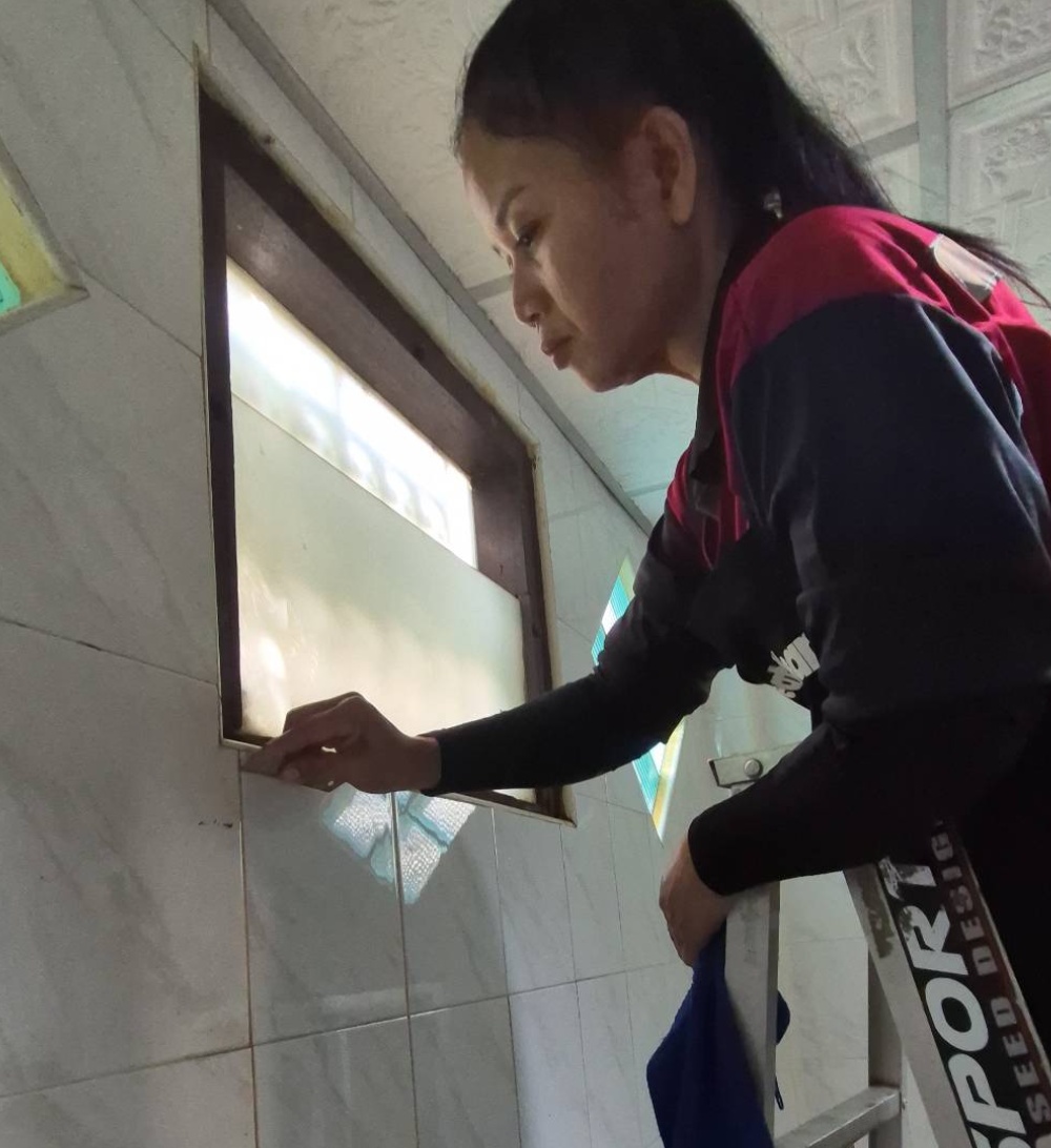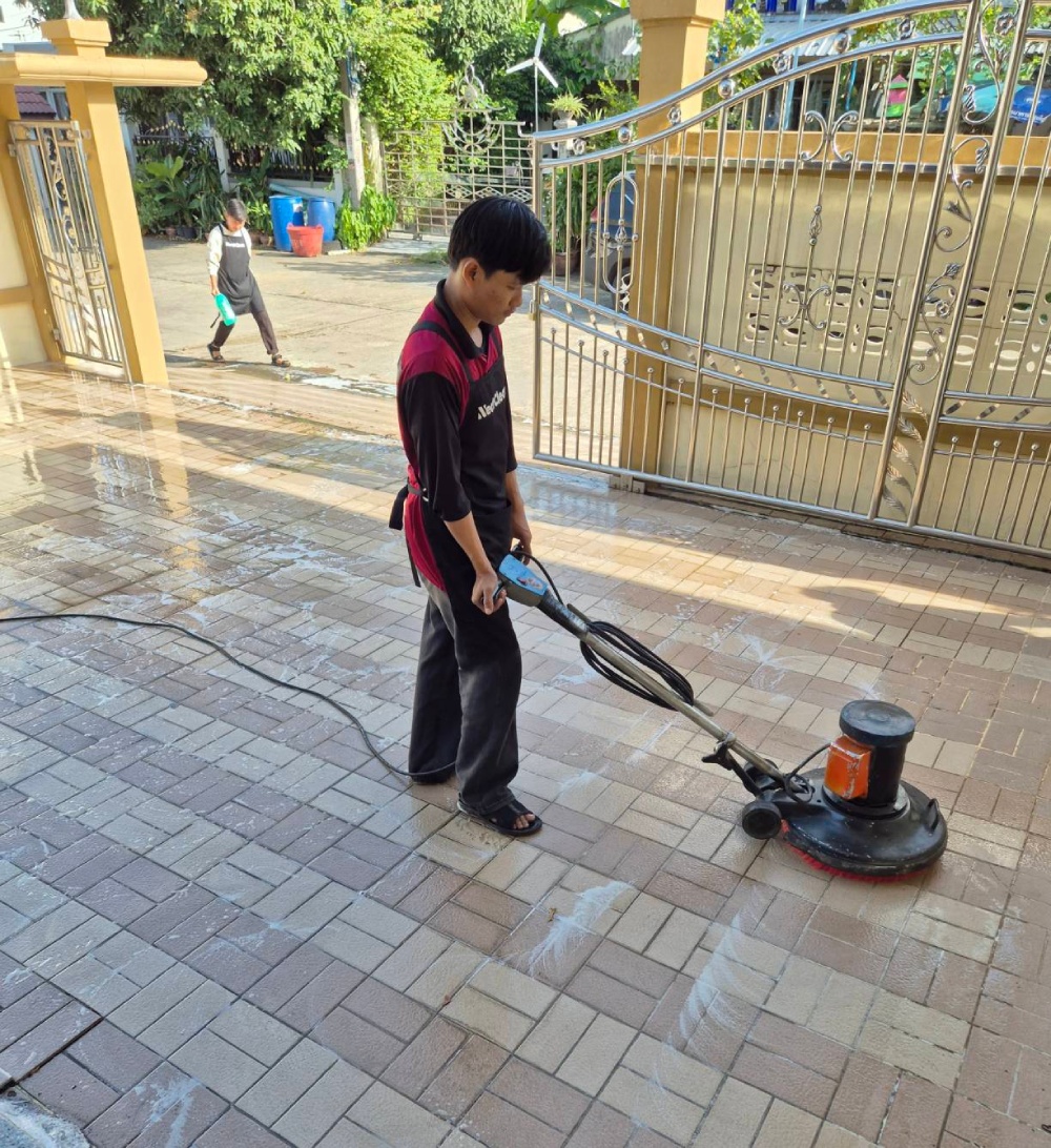 - ขัดทำความสะอาดพื้น ผนังและสุขภัณฑ์ให้สะอาดหมดจด